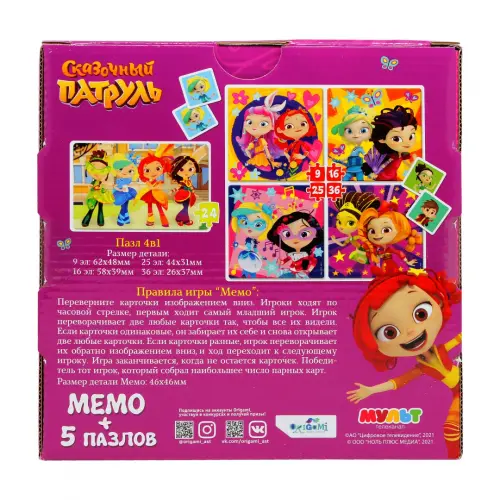 Игровой набор Сказочный патруль – это интересная игра мемо, которая тренирует память, логику и внимательность ребёнка, а также 5 ярких пазлов с красивыми картинками. Играйте вместе с нами!