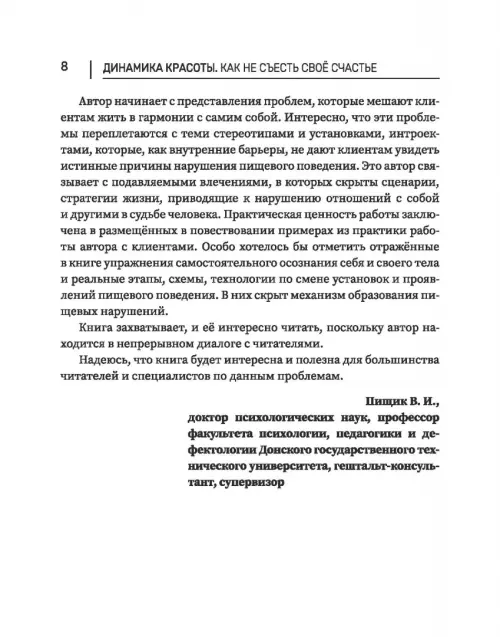 Погружение в эту книгу было как путешествие в психологию питания и самоприятия. Затронута каждая из фасеток сложного отношения человека к еде и собственному телу. Ценные уроки и персональные истории в каждой главе напомнили мне, что истинная красота начинается внутри, а счастье — это выбор, который мы делаем каждый день.