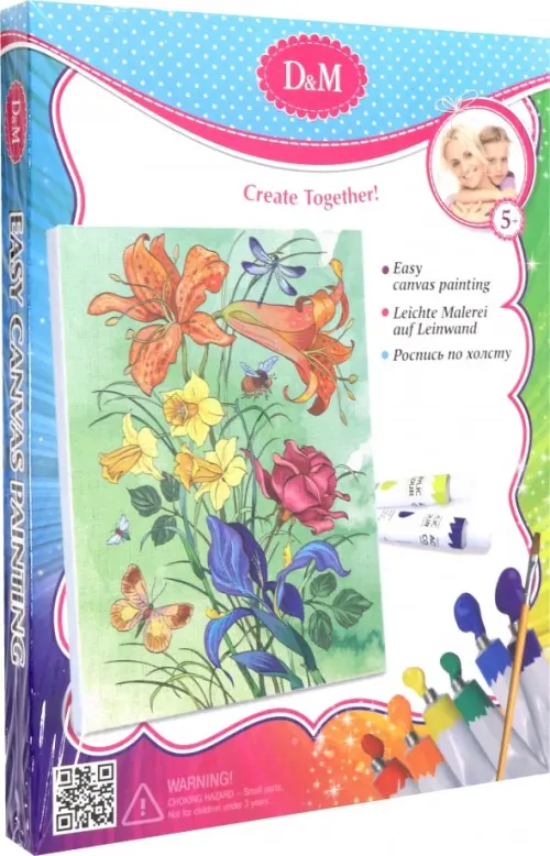 В наборе: холст на рамке, 4 краски, кисть, палитра.