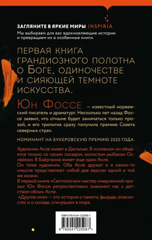 Первая книга грандиозного полотна о Боге, одиночестве и сияющей темноте искусства. Номинант на Букеровскую премию 2020 года. Юн Фоссе - именитый норвежский писатель и драматург. Помимо пьес, он пишет стихи и романы, детские книги и эссе. Несколько лет назад Фоссе заявил, что отныне будет заниматься только прозой, и его "Трилогия" сразу получила Премию Совета северных стран. Художник Асле живет в Дюльгью. В основном он общается только со своим соседом, холостым рыбаком Ослейком. В Бьёргвине живет еще один Асле. Он тоже художник. Оба Асле дружат и в каком-то смысле представляют собой две версии одной и той же жизни. В первой книге "Септологии" мастер "медленной прозы" Юн Фоссе ретроспективно знакомит нас с детством обоих Асле. "Другое имя" - это история о памяти, фьорде, опасностях и о соседе, сгинувшем в море.