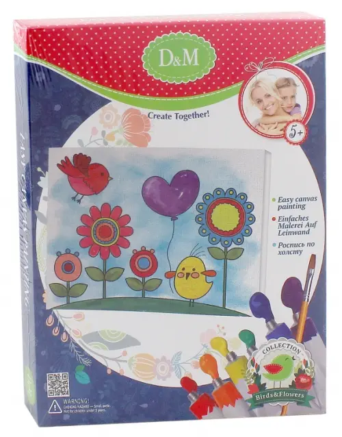 В наборе: холст с контурным рисунком, 4 акриловых краски, кисть, палитра, инструкция по смешиванию цветов.