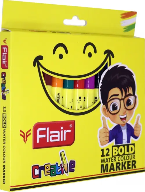 Утолщенные фломастеры FLAIR CREATIVE имеют удобную круглую форму корпуса, длина 135 мм, толщина линии письма 1-3,5 мм. 12 ярких цветов. Полипропиленовый корпус продлевает срок жизни фломастеров.