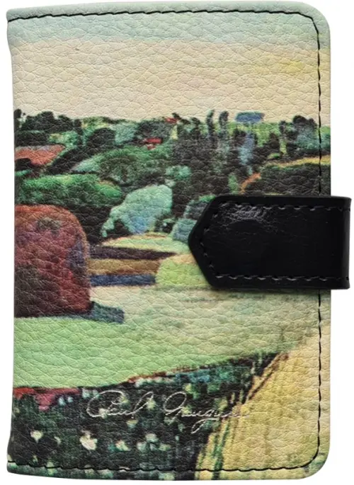 Снаружи - фактурная искусственная кожа с печатью картины Поля Гогена "Стога сена в Бретани". 1890г, внутри - 12 пластиковых кармашков для визитных карточек.