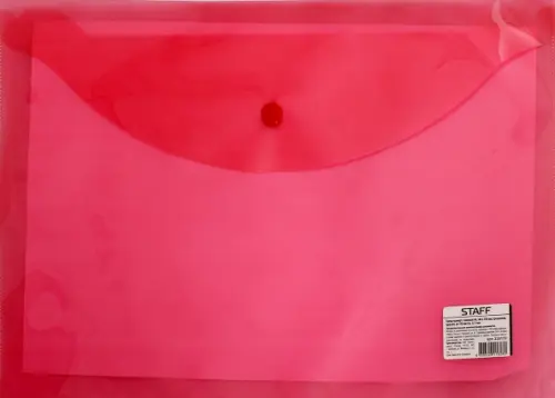 Изготовлена из прозрачного пластика красного цвета толщиной 120 мкм. Папка-конверт с гладкой фактурой формата А4 закрывается на защелку-кнопку, что делает удобным частое использование и обеспечивает быстрый доступ к ее содержимому. Папка способна вместить до 100 листов стандартной плотности.