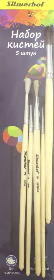 В наборе 5 штук: белка круглая №1, коза круглая №3, пони круглая №2, 5, щетина плоская №6.