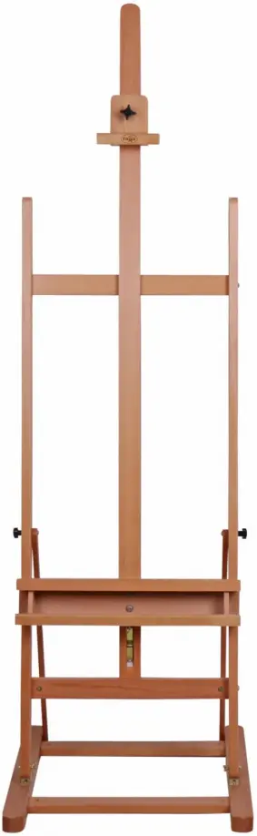 Профессиональный напольный мольберт для работы в студии. Предназначен для станковой живописи, подходит для больших полотен. Максимальная устойчивость благодаря широкому основанию, большая полка для кистей и красок. Мачту можно наклонить на себя для проработки мелких деталей или сушки работ. Механизм плавного опускания мачты позволяет легко перемещать полотно вверх или вниз.
