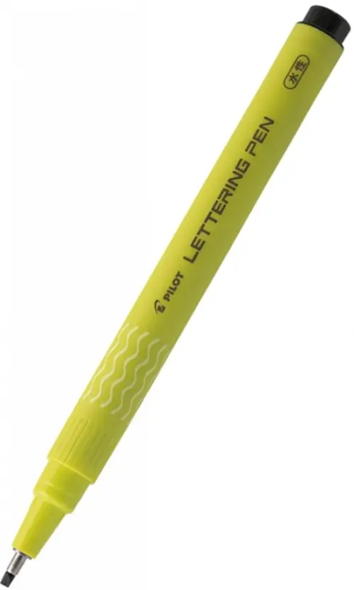 Корпус ручки сделан из пластика желто-зеленого цвета. На съемном колпачке имеется подсказка с толщиной линии.