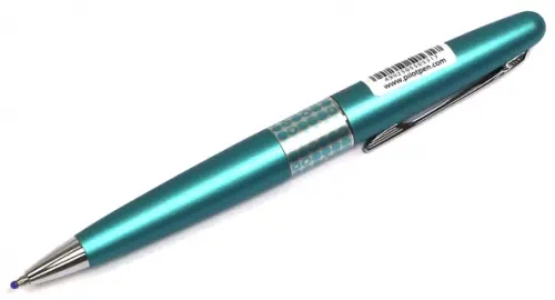 Все детали корпуса, в том числе наконечник и клипса изготовлены из металла. Поверхность корпуса матовая. Принцип работы шариковой ручки - поворотный механизм. Цвет корпуса светло-голубой металлик, матовая поверхность. В середине кольцо с геометрическим рисунком "кружочки". Надежный пишущий узел изготовлен из нержавеющей стали, шарик выполнен из карбида вольфрама, что обеспечивает мягкое письмо и контролирует расход чернил. Чернила отличаются высокой светостойкостью и насыщенностью, а благодаря масляной основе обеспечивают мягкое, плавное и непрерывное письмо, без подтеков.