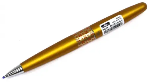 Все детали корпуса, в том числе наконечник и клипса изготовлены из металла. Поверхность корпуса матовая. Принцип работы шариковой ручки - поворотный механизм. Цвет корпуса оранжево-золотой металлик, матовая поверхность. В середине кольцо с рисунком "цветы". Надежный пишущий узел изготовлен из нержавеющей стали, шарик выполнен из карбида вольфрама, что обеспечивает мягкое письмо и контролирует расход чернил. Чернила отличаются высокой светостойкостью и насыщенностью, а благодаря масляной основе обеспечивают мягкое, плавное и непрерывное письмо, без подтеков.