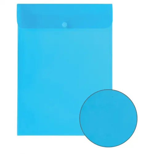 Папка-конверт из плотного прозрачного пластика с вертикальной загрузкой бумаг. Закрывается на защелку-кнопку. Идеальное средство для транспортировки документов. Плотность: 0,15 мм.