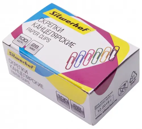 Скрепки канцелярские "Silwerhof", цвет: в ассортименте, 28 мм, 100 штук, арт. 492022