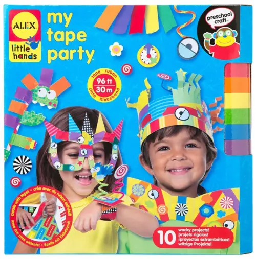 В наборе: 6 рулонов ленты (30 м), 165 наклеек и бумажных форм, бумажный стаканчик, цветная бумага, порезанная соломкой, бумажные трубочки.