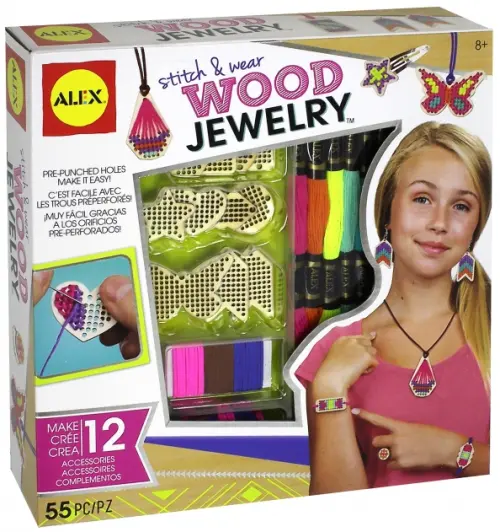 В наборе: 12 деревянных шармов-заготовок, 4 деревянные бусины, 6 разноцветных нитей, 11 шнурков, 2 швейные иглы, 2 крючка для сережек, 12 пружинок, и простые инструкции.