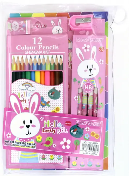 В комплекте: раскраска, 12 цветных карандашей, набор чернографитных карандашей (НВ), точилка, ластик.
