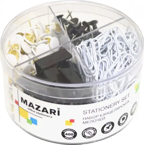 Невероятно полезный и универсальный набор! Кнопки силовые и канцелярские также оказались весьма практичными и удобными в использовании. Зажимы для бумаги отличаются хорошей фиксацией и не соскальзывают, что существенно облегчает работу с документами.