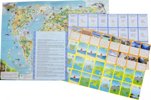В комплекте: игровое поле, фишки, кубик, листы с карточками (64 карточки с вопросами, заданиями, "экскурсиями" по достопримечательностям Мира), ответы на вопросы.