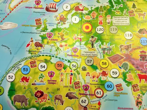Игра для семейного досуга "Мир", сделанная на основе физической карты Мира. Географию интереснее изучать по географическим настольным играм! Вы узнаете, где растет колбасное дерево, какой цветок самый большой в мире, чем знаменита пустыня Намиб и многое другое. Побеждает тот, кто больше узнает! (и первым пройдёт весь маршрут). За каждый правильный ответ на вопрос или найденный клад Вы получаете дополнительные очки и это отличный шанс обойти соперников! Очень простые правила.