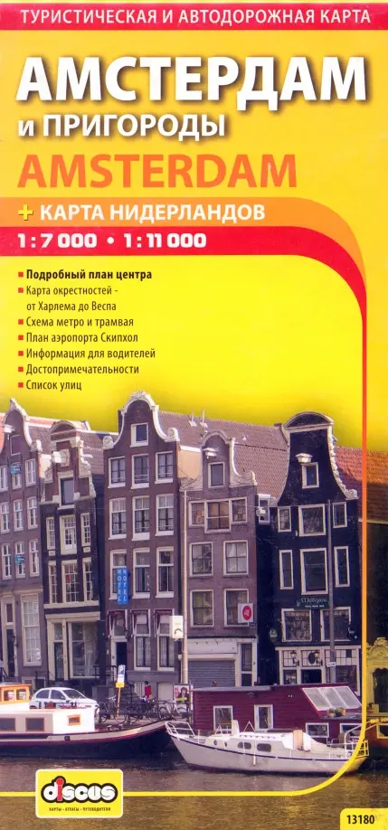 Амстердам и пригороды. Автодорожная и туристическая карта. Масштаб: 1:7 000, 1:11 000. Подробная карта города. Список улиц. Схема метро и трамвая. Информация для водителей. Достопримечательности. Гостиницы.
