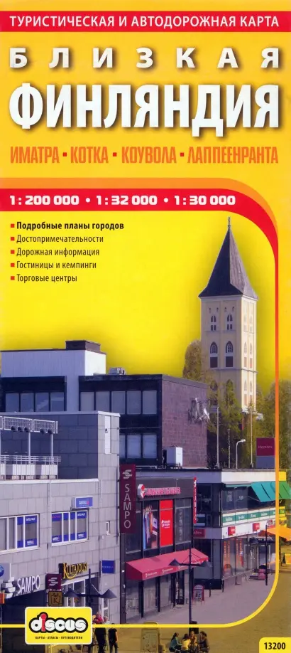 Подробная карта с планами городов посвящена тем областям Финляндии, которые наиболее популярны среди наших сограждан, и не только для туризма, но и для самых разнообразных "соседских" поездок за рулём своей автомашины. Например, за выгодными покупками. Такая карта издаётся впервые. Она выполнена в складном формате на прочной мелованной бумаге. Карта составлена по лицензии и с использованием материалов финского картографического предприятия Karttakeskus. Кроме финской территории, она охватывает и приграничные районы Ленинградской области РФ (Выборгский район Ленинградской области), где показана дорожная сеть, объекты автодорожного сервиса и пограничные пропускные пункты (на собственных материалах "Дискус Медиа"). На обзорной карте масштаба 1:200 000 отображена в основном территория губернии Южная Финляндия. Показано её административно-территориальное деление (границы провинций и коммун), особо отмечены границы национальных парков и других природоохранных зон, а также зон военного назначения - ограниченного доступа. Нанесена сеть автомобильных дорог с их классификацией, вплоть до частных и просёлочных, с указанием номеров и расстояний между населёнными пунктами. Кроме того, показаны линии железных дорог, озёрного и морского пассажирского сообщения, туристские пешеходные тропы. Обозначена путевая инфраструктура (шлагбаумы и шлюзы, автовокзалы и пристани, АЗС), наиболее интересные достопримечательности. Географические названия на территории Финляндия приведены на финском языке, часть из них продублирована по-русски. На планах городов показана улично-дорожная сеть и сеть железных дорог, обозначены и подписаны на двух языках туристические и спортивные объекты, торговые центры, гостиницы. Особыми знаками отмечены пляжи. В индексированном двуязычном перечне объектов перечислены гостиницы, кемпинги, другие объекты размещения, достопримечательности и торговые центры не только в четырёх крупных городах, но и на всей территории Южной Финляндии, которую охватывает карта.