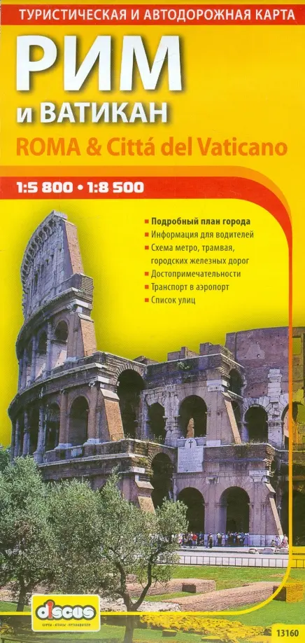 Издание на русском и итальянском языках в серии "Карты зарубежных городов" содержит максимум полезной информации для туристов, желающих самостоятельно ознакомиться со столицей Италии. В это издание включены: автодорожная карта Рима и окрестностей, подробная карта центральной части Рима (в том числе государство Ватикан), схема основных видов транспорта и врезка с планом подъездных путей к аэропорту. На карту нанесены линии и станции городского транспорта, автомобильные дороги с указанием их номеров и категорий, исторические памятники, дворцы и храмы, музеи, театры и другие культурные центры, гостиницы, парковки, туристические справочные бюро. Выдающиеся памятники архитектуры показаны в виде трёхмерных цветных рисунков. Географические названия, названия улиц и достопримечательностей даны на итальянском языке, многие из них продублированы в русском переводе или транскрипции. Справочный раздел содержит алфавитный указатель улиц и гостиниц, двуязычный перечень достопримечательностей Рима и Ватикана, список торговых центров и другую информацию. Издание подготовлено на картографическом материале немецкой фирмы iPublish и адаптировано для российского потребителя. Издание возобновляемое, представлен последний выпуск.