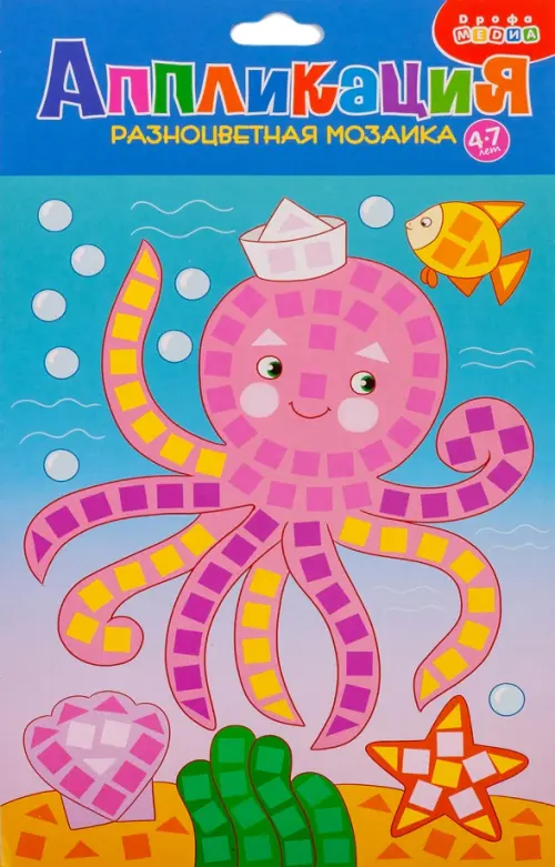 Разноцветная мозаика - это оригинальная и яркая объёмная аппликация. Детали мозаики выполнены из мягкого пластика ЭВА с переливающимся декоративным покрытием. Ребёнок с удовольствием украсит забавного осьминога, аккуратно отделяя нужные детали и приклеивая их на картинку. Когда картинка будет готова отрежьте верхнюю часть и полюбуйтесь проделанной работой!