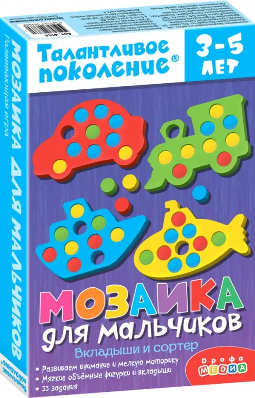Мозаика для мальчиков это возможно лучший познавательный выпуск в серии "Талантливое поколение" от "Дрофа-Медиа". Юных инженеров и конструкторов знакомят с различными видами транспорта: воздушным, железнодорожным, морским и даже подводным! Вместе с развитием мелкой моторики ребята учатся также считать. Цена в "МАЙШОП" ...
