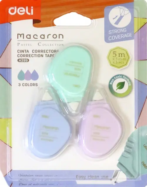 Набор корректирующей ленты. В наборе 3 штуки. Размер одной ленты: 5 м x 5 мм. Цвет корпуса: ассортимент. Тип упаковки: блистер. Сделано в Китае.