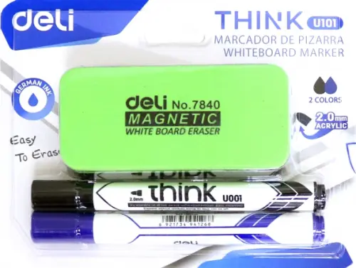 Набор маркеров Deli для магнитных планеров и белых досок, предназначены для многоразового использования - пиши-стирай. Идеальные маркеры для использования на школьных занятиях и детского творчества. Форма наконечника: пулевидный. Повышенная светостойкость, наконечник устойчив к повреждению и истиранию. Легко стирается, не оставляет следов на поверхности. В набор входят: 2 маркера синий и черный, стиратель для досок. Диаметр пишущего наконечника: 2 мм. Нетоксичные чернила с невыраженным запахом. Упаковка: блистер.