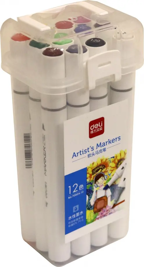 Набор двусторонних маркеров для скетчинга. Скошенный и пулевидный наконечники. Количество в упаковке: 12. Количество цветов: 12. Круглый корпус. Упаковка: пластиковая коробка. Сделано в Китае.
