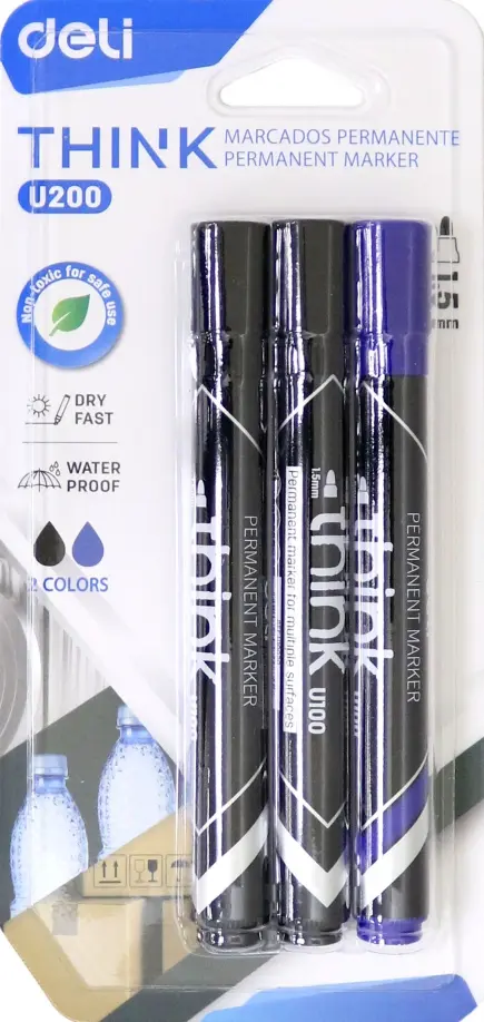 Набор маркеров перманентных Deli 0.5-1мм. Предназначены для письма на любой поверхности: бумага, полиэтилен, дерево, стекло, металл, натуральная кожа, ткань, камень, плитка. Влагостойкие, быстросохнущие, со слабым запахом, не выцветают, стойкие к стиранию. Количество в упаковке: 3. Количество цветов: 2 (2 черных, 1 синий). Упаковка: блистер.
