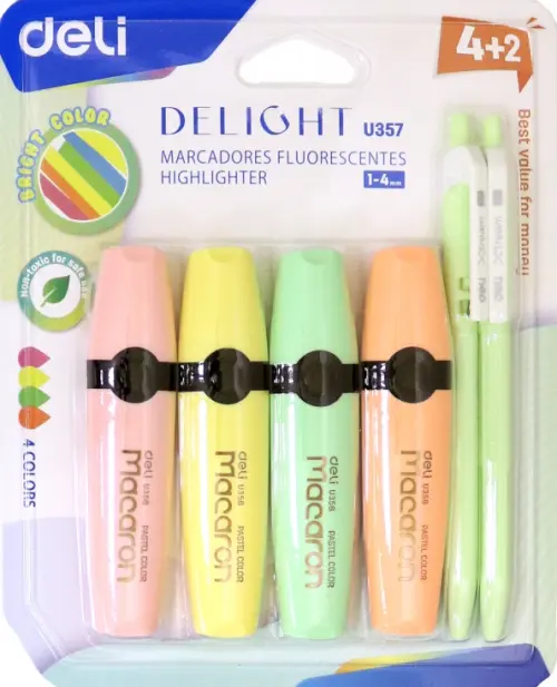 Набор текстовыделителей Deli с двумя ручками в комплекте. Текстовыделители предназначены для выделения текста на бумаге любого типа. Модный маркер текстовыделитель - отличный выбор для любителей ярких оттенков. Удобный и надежный колпачок облегчит хранение. Чернила на водной основе не имеют запаха, мгновенно высыхают на любом типе бумаге, не пропитывая ее и не смазывая текст. Большой запас чернил и их экономичный расход. Приятный и оригинальный дизайн порадует каждого покупателя. В наборе: 4 разноцветных текстовыделителя, 2 шариковых автоматических ручки. Тип упаковки: блистер.