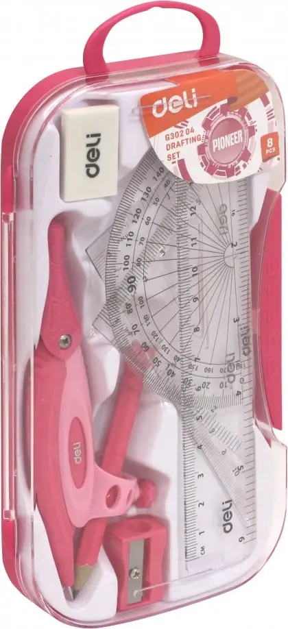 Набор для черчения Deli состоит из 7 предметов: циркуль, линейка, транспортир, 2 угольника, карандаш, ластик. Набор предназначен для чертёжных работ и станет незаменимым инструментом, как для школьника, студента, так и для профессионала. Упакован в пластиковую коробку с европодвесом. Материал: пластик. Цвет в ассортименте.