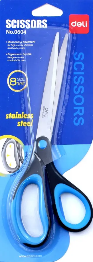 Качественные стальные ножницы от бренда Deli. Поставляются в прозрачной прочной упаковке, на которой произволитель сообщает, что сталь получила закалку и надлежащим образом заточена. Действительно увесистые и острые. Симпатичные, хорошая эргономика. Приятно держать в руке. Подходят для бытовых целей и занятий. Хорошее приобретение, прослужат долго!