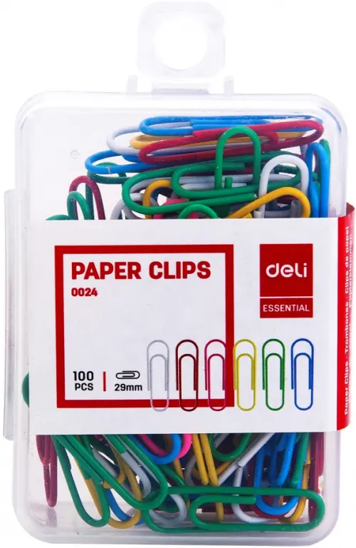 Скрепки Deli, 29 мм, 100 штук, пластиковая оболочка, цвета в ассортименте (E0024)
