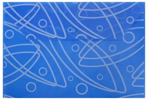 Горизонтальный конверт из пластика, полупрозрачный с рисунком. Закрывается на кнопку. Толщина: 0,18 мм. Формат: А4.