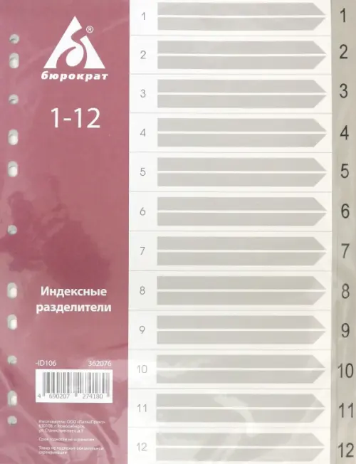 Индексные разделители из полипропилена помогут Вам найти нужный документ в считанные секунды, организовать работу, сделать ее легче и приятнее. Они предназначены для создания абсолютного порядка при хранении и систематизации Ваших документов. Универсальная перфорация - 11 отверстий. Позволяет использовать разделитель, как в папках - регистраторах, так и в папках на кольцах и с механизмами. На табуляторах находятся цифры или буквы. Возможны группировки документов по дням недели и месяцам, цифровые и алфавитные. На титульном листе размещена информация о количестве разделов, что позволяет потребителю легко найти нужный продукт. Тип: индексные разделители Формат: А4 Материал: полипропилен Опции: титульный лист Маркировка: штрих-код на каждом изделии Цвет: серый Разделы: на табуляторах находятся цифры: 1- 12 (12 разделов).