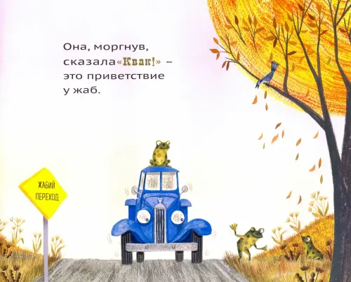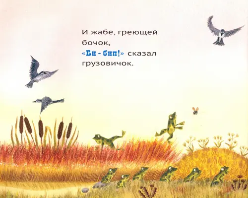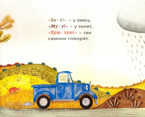 Напоминающие фольклорные мотивы строки стихотворения знакомят читателей с Голубым грузовичком и обитателями скотного двора, которых он встречает, пока едет по проселочным дорогам мимо своего сельского дома. Первая половина книги - очаровательная, приводящая в оцепенение симфония сигналов машины и звуков животных. Веселый текст имитирует прыгающий грузовик, а теплые иллюстрации в народном стиле дополняют картину. Начинается дождь, и в историю вступает подлый, напыщенный самосвал. Когда же самосвал попал в грязь и сигналит о помощи, никто его не слышит. Голубой грузовичок хочет помочь, но тоже застревает. И когда он кричит о помощи, животные бегут ему на выручку. Так самосвал узнает, что: «Ты мне помог, тебе – друзья. Нам без друзей никак нельзя!». Это забавная, шумная история, которая найдет себе место в каждой домашней библиотеке.