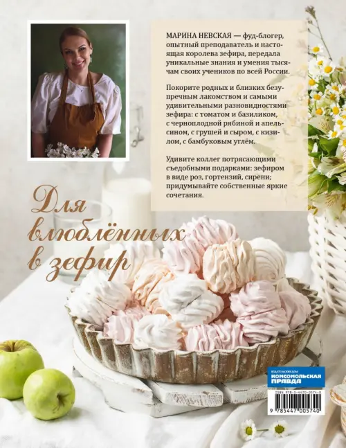 Для влюблённых в зефир! Марина Невская - фуд-блогер, опытный преподаватель и настоящая королева зефира, передала уникальные знания тысячам своих учеников по всей России. Теперь всем доступны секретные технологии и уникальные рецепты любимого лакомства и десертов с зефиром. Покорите родных и близких безупречным лакомством и удивительными вкусами зефира: с томатом и базиликом, с черноплодной рябиной и апельсином, с грушей и сыром, с кизилом, с бамбуковым углём. Удивите коллег потрясающими съедобными подарками: зефиром в виде роз, гортензий, сирени; придумывайте собственные яркие сочетания.