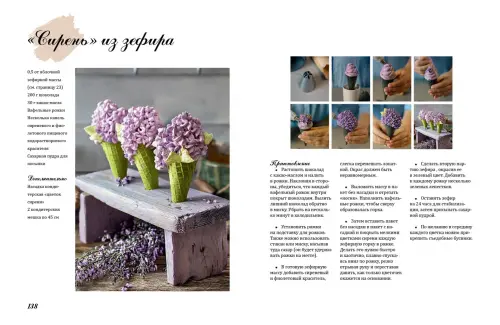 3Потрясающие техники показаны пошагово. Из зефира можно сделать розы, гортензии и сирень, приготовить «мороженое» и праздничный торт.