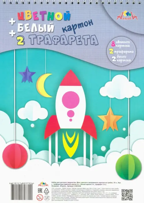 Цветной мелованный картон с трафаретам А4, 12 листов на гребне. ТМ Апплика. Формат А4, размер 200 х 280 мм, Внутренний блок изготовлен из мелованного картона. Плотностью 230 гр/м2. В наборе 8 листов цветного картона цвета: красный, желтый, синий, зеленый, розовый, оранжевый, коричневый, черный + 2 листа белого картона + 2 трафарета из плотного картона. Обложка из мелованного картона. Блок и обложка скреплены евро спиралью. Набор предназначен для создания детских поделок, аппликаций и декорирования. Картон легко режется ножницами, сгибается и клеится. В наборе 2 листа трафаретов из плотного картона по 10-12 фигур на каждом. Набор предназначен для детей от 3-х лет.