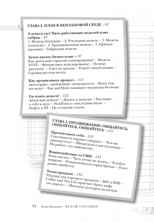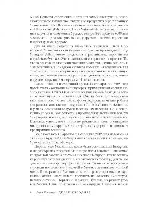 Книга известной журналистки и ведущей телеканалов РБК и "Россия-1" Елены Николаевой посвящена одновременно и бизнесу, и самореализации. Точнее - самореализации в бизнесе. Автор журналов "Сноб" и "Эксперт", Николаева в течение ряда лет скрупулезно собирает материал о молодых российских компаниях. В книгу вошли 64 успешных кейса из различных отраслей - от сельского хозяйства до ИТ-сектора, и различного масштаба - от индивидуального предпринимательства до крупных диверсифицированных компаний. Это мотивирующие истории восхождения на вершину успеха, откровенный разговор с их героями об ошибках и удачах, об особенностях отечественного бизнеса. Автор избегает позиции ментора и дает слово самим предпринимателям, людям разного возраста и опыта, которых объединяет лишь одно - они добились успеха. Это первая на российском рынке книга с элементами дополненной реальности. При наведение смартфона на специальные метки, появляются трехмерные объекты и запускаются видеоролики.