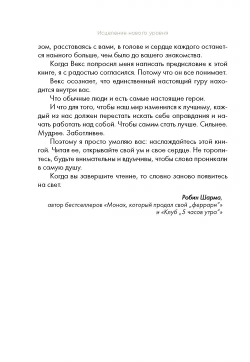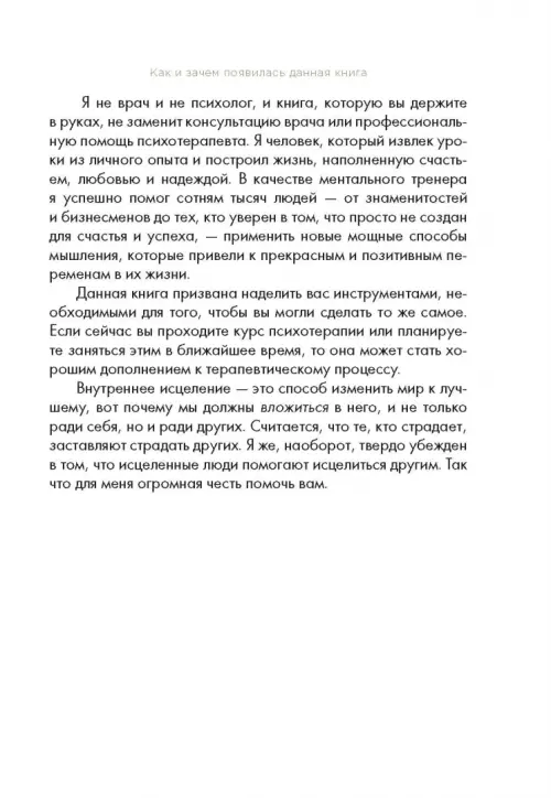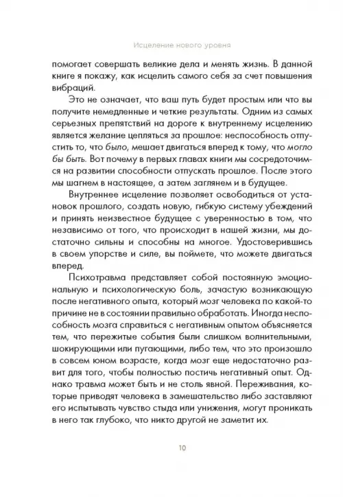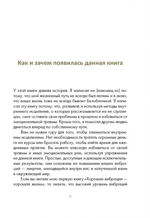 Мудрость, помогающая справиться с душевными травмами и понять, что самый важный в жизни успех - это внутреннее исцеление Векс Кинг, автор бестселлера "Хорошие вибрации - хорошая жизнь", поможет вам достичь ментального исцеления, отпустить старые травмы и обрести ясность мышления, стойкость характера и настоящую свободу. Многим из нас случалось переживать те или иные психологические травмы. Это могут быть старые эмоциональные потрясения, которые мы многие годы носим в себе, или свежие, еще не зарубцевавшиеся раны. Они могут казаться серьезными или незначительными, могут быть эмоциональными, физическими или духовными. Что бы ни являлось причиной ваших страданий, Векс Кинг приветствует вас с распростертыми объятиями. Цель Векса - помочь читателям стать целителями самих себя. Он хочет, чтобы вы поняли, насколько может быть успешной и счастливой ваша жизнь, если вы избавитесь от застарелых страхов. Эта книга позволит вам: - Исцелиться путем повышения вибраций - Изменить свою жизнь к лучшему - Создать систему убеждений, позволяющую без страха смотреть в будущее - Отказаться от временных и чаще всего опасных способов притупления эмоциональной боли - Овладеть новыми инструментами, упражнениями и рекомендациями Если вы хотите избавиться от груза прошлых травм и обрести счастье, нет нужды тратить огромные деньги на лечение. В книге вы найдете все необходимое, чтобы исцелиться собственными силами и подняться на новый уровень жизни.
