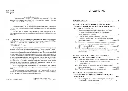 Монография посвящена вопросам институциональной трансформации, вызванной титаническими сдвигами в технологиях, информации, коммуникационных процессах. Институциональная среда характеризуется качественными изменениями в производственном процессе, в обществе и в индивидуальном пространстве каждого человека. Рассмотрены такие проблемы, как бесконтактная экономика и ее функционирование, трансформация структуры потребления и производства, углубление цифрового неравенства. Рассмотрен рынок труда в условиях коронаэкономики, который претерпевает серьезную модификацию в результате изменения спроса на труд и адаптации работников к новым условиям. Институциональная трансформация рассмотрена на примере коммерческой тайны как института современного предпринимательства. Монография адресована широкому кругу читателей, интересующихся институциональной теорией и причинами трансформации институтов и всей институциональной среды.