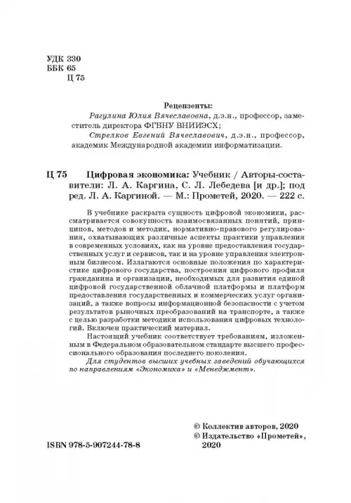 Если вы обнаружили ошибку в описании товара «Цифровая экономика. Учебник» (авторы: Каргина Лариса Андреевна, Вовк Алексей Александрович, Лебедева Софья Леонидовна), то выделите её мышкой и нажмите Ctrl+Enter. Спасибо, что помогаете нам стать лучше!