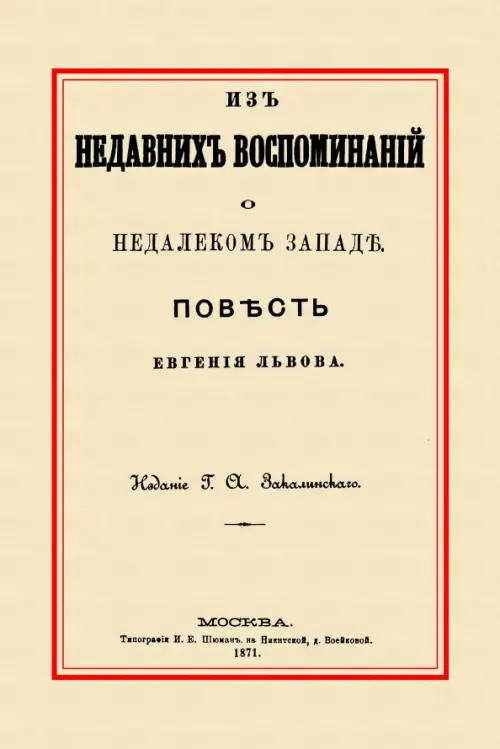Репринт с издания. Москва, 1871. Кочетов Евгений Львович (писал под псевд. Евгений Львов и Русский странник) (13[25].01.1845-26.01[8.02]. 1905), беллетрист и публицист. Патриотическим настроем проникнута и книга "Из недавних воспоминаний. . . ", посвященная нелегкой судьбе дворянина и офицера Кречетова (созвучие с фамилией автора), попавшего в немилость к властям из-за своего горячего характера. Зарисовки мытарств главного героя, встречающего на своем пути не только несправедливость и жестокость, как со стороны "мироедов" различных национальностей, так и со стороны русских имперских властей, но и примеры истинного человеколюбия, его стойкость в самых тяжелых жизненных ситуациях, которая и приводит его в финале к духовному очищению, и составляют канву произведения. Читатели благодарили автора "за беспристрастный, чисто русский взгляд на события, за смелые обличения антирусских интриг". При ознакомлении с книгой порою удивляешься тому, насколько проницателен был автор в своей оценке событий, суть и глубинные причины которых не изменились и по сей день. Книга изготовлена по технологии "печать по требованию". Тираж 30 экз.