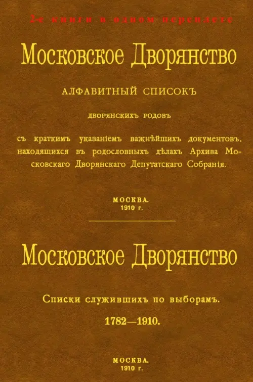 Репринт с изданий Москва, 1910. Две книги, изданные в 1910 г. Алфавитный список дворянских родов. - В продажу издание не поступало. Тираж был 38 экз. Одна из самых редких книг по истории Московского Дворянства. ( Алфавитный список дворянских родов с кратким указанием важнейших документов, находящихся в родословных делах Архива Московского Дворянского Депутатского Собрания). Издание представляет собой перечень фамилий, которым было пожаловано дворянство и чьи дела (копии указов о присвоении, ходатайства, грамоты и т. п. ) находятся в Центральном историческом архиве г. Москвы. Редкий справочник, посвященный Московскому дворянству. + Списки служивших по выборам 1782-1910. В издание вошли списки лиц, служивших по выборам московского дворянства во всех губернских и уездных должностях, начиная со времени открытия дворянских учреждений. В списки, в частности, вошли фамилии людей, занимавших выборные губернские должности и должности в пятнадцати уездах Московской губернии – это предводители дворянства, депутаты, члены опеки, судьи, заседатели судов и другие. Перечни дворянских фамилий поделены на Губернские должности; Уездные должности: Московский, Коломенский, Дмитровский, Волоколамский, Можайский, Звенигородский, Серпуховской, Рузский, Верейский, Клинский, Бронницкий, Подольский, Богородский, Воскресенский, Никитский уезды. Тираж 30 экз. выполнен по технологии print-on-demand.