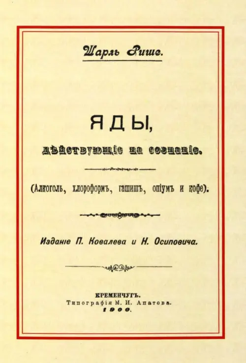 Репринт с издания. Издание П. Ковалева и Н. Осиповича, Типография М. И. Апатова (Кременчуг) 1900. Научно-популярный очерк о влиянии алкоголя, хлороформа, гашиша, опиума и кофе на умственные способности. Шарль Робер Рише (фр. Charles Robert Richet; 1850 - 1935) - французский физиолог, пионер во многих областях исследований, таких как нейрохимия, пищеварение, терморегуляция у гомойотермных животных и дыхание. Лауреат Нобелевской премии по физиологии и медицине в 1913 году. Книга изготовлена по технологии "печать по требованию". Тираж 30 экз.