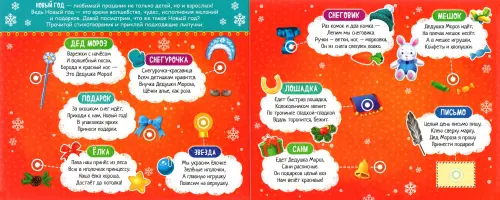 Обучающая книга с липучками направлена на расширение кругозора малыша. Внутри ребёнок найдёт интересные задания и загадки, а также сможет оживить новогоднюю историю с милыми зверятами. Как играть с яркими липучками Липучки уже приклеены в книгу и на карточки. Малышу необходимо лишь крепить героев на странички. Если случайно потеряется пара липучек, не расстраивайтесь, ведь в комплекте есть запасные. Книга оснащена специальным конвертом для хранения липучек. Для того чтобы обучение было более продуктивным, рекомендуем взрослым заниматься вместе с малышом. Книга предназначена для детей от 3 лет. Комплектация Картонная книга. 10 фигурных карточек со зверятами. Набор твёрдых и мягких липучек на клеевой основе.