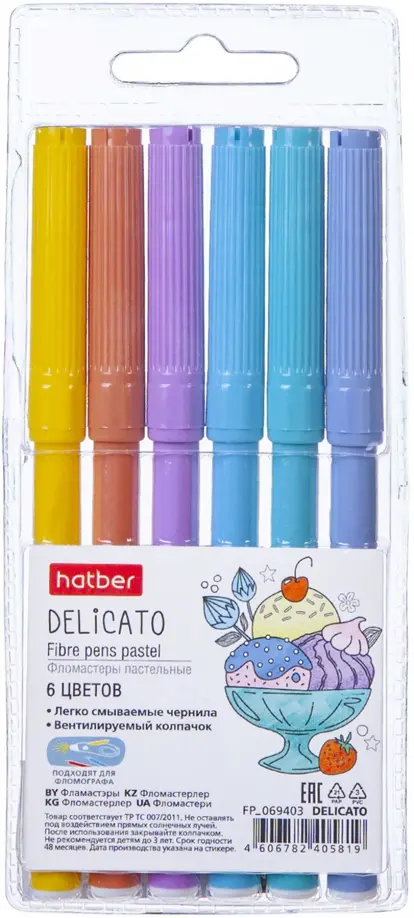 Фломастеры для рисования на бумаге и раскрашивания, подходят для детей младшего и школьного возраста. Мягкая пастельная цветовая гамма расширяют возможности для творчества: добавляют рисункам мягкости и спокойствия, создают невесомое настроение и дарят ощущение уюта и безопасности. Чернила нетоксичны и безопасны для детей, легкосмываемые с рук и одежды. Специальная форма пишущего узла предотвращает его проваливание внутрь корпуса при сильном нажатии. В наборе 6 пастельных цветов. Увеличенный размер пишущего узла: 2,3 мм. Увеличенная длина письма: 600м. Вентилируемый колпачок. Дополнительные грани на колпачке предотвращают случайное скатывание фломастера со стола. Данные фломастеры подходят для фломографа HATBER. Фломастеры упакованы в блистер с европодвесом.