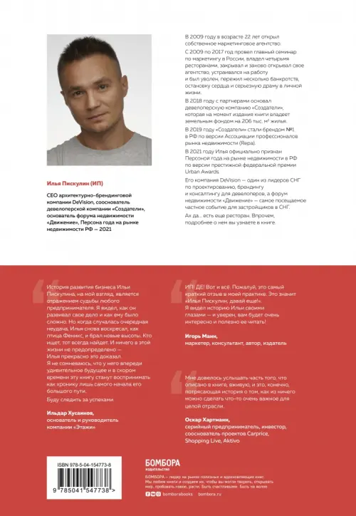 В 2009 году в возрасте 22 лет открыл собственное маркетинговое агентство. С 2009 по 2017 год провел главный семинар по маркетингу в России, владел четырьмя ресторанами, закрывал и заново открывал свое агентство, устраивался на работу и был уволен, пережил несколько банкротств, остановку сердца и серьезную драму в личной жизни. В 2018 году с партнерами основал девелоперскую компанию "Создатели", которая на момент издания книги владеет земельным фондом на 206 тыс. кв. м жилья. В 2019 году "Создатели" стали брендом № 1 в РФ по версии Ассоциации профессионалов рынка недвижимости (Repa). В 2021 году Илья официально признан Персоной года на рынке недвижимости в РФ по версии престижной федеральной премии Urban Awards. Его компания DeVision - один из лидеров СНГ по проектированию, брендингу и консалтингу для девелоперов, а форум недвижимости "Движение" - самое посещаемое частное событие для застройщиков в СНГ. Ах да. . . есть еще ресторан. Впрочем, подробнее о нем вы узнаете в книге.